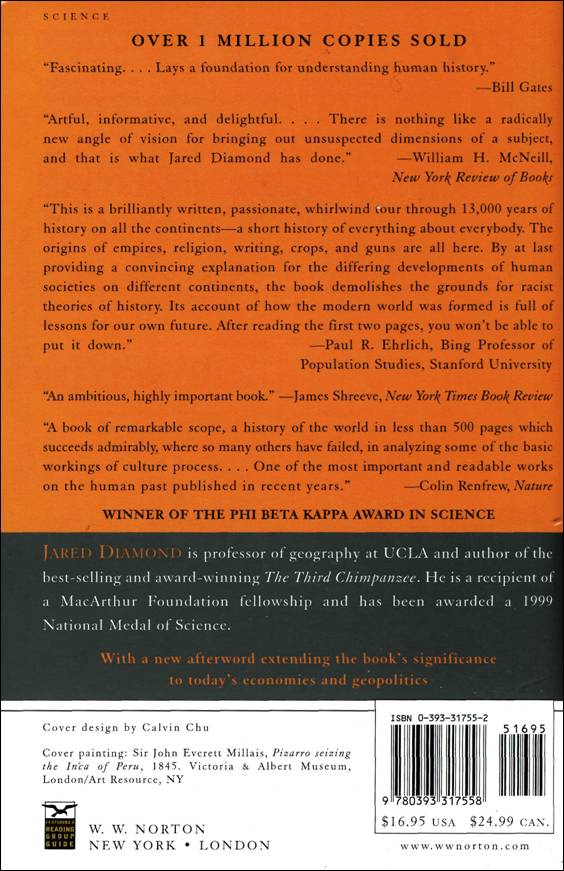 "[Jared Diamond] is broadly erudite, writes in a style that pleasantly expresses scientific concepts in vernacular American English, and deals almost exclusively in questions that should interest everyone concerned about how humanity has developed. . . . [He] has done us all a great favor by supplying a rock-solid alternative to the racist answer. ... A wonderfully interesting book." —Alfred W. Crosby, Los Angeles Times