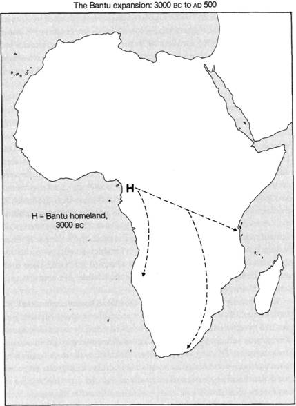 Figure 19.4. Approximate paths of the expansion that carried people speaking Bantu languages, originating from a homeland (designated H) in the northwest corner of the current Bantu area, over eastern and southern Africa between 3000 b.c. and a.d. 500.